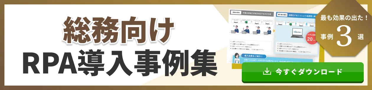 なお「何から手を付けたらよいのかわからない」という担当者様におすすめの方法は、RPAを活用して総務部門のアナログ作業を自動化する方法です。作業の自動化によって、煩わしい単純作業の負担を軽減できれば、心にも余裕が出てDXも推進しやすくなるでしょう。