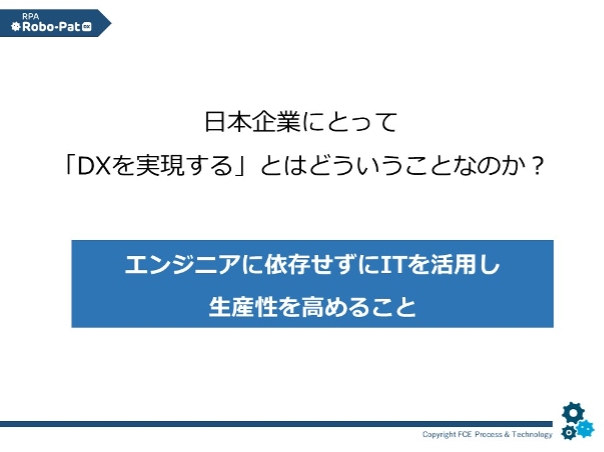 加えて、エンジニアがいる前提のRPAは、エンジニア不足に陥ったときに機能しなくなる可能性が高くなります。だからこそ「エンジニアに依存しないRPA」が必要だとロボパットDXは考えたのでしょう。そしてその未来は高い確率でやってきます。