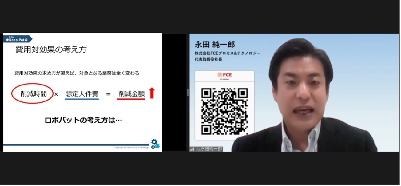 今回のセミナー、講師は株式会社FCEプロセス&テクノロジーの代表取締役の永田社長。RPAやDXについて、非常にわかりやすく丁寧に解説をしてくださいました。