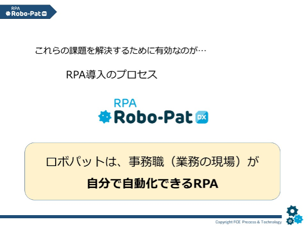 今回参加したセミナーを主催する株式会社FCEプロセス&テクノロジーが開発・販売している純国産のRPAツール、それが「ロボパットDX」です。