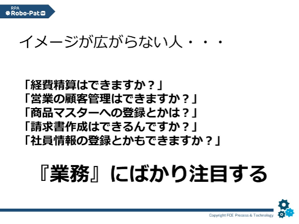 しかし、永田社長いわくRPAを最大限活用するためには、業務単位ではなく作業単位で考えないとダメとのこと。つまり、業務全体ではなく一部を任せることで、結果として全体の生産性を向上できるそうです。