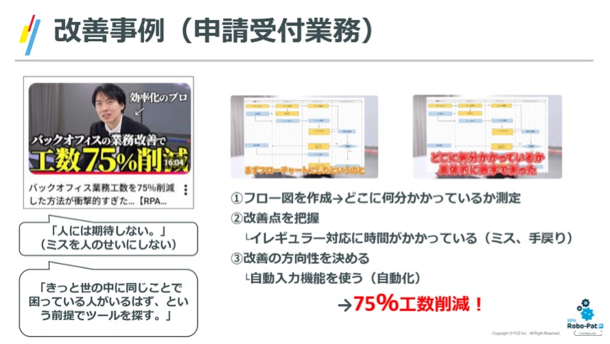 ある企業では、申請受付業務のフロー図を作成した結果、入力不備による「イレギュラー対応」に多くの時間が割かれていることが判明しました。そこで、申請フォームに入力ミスを防ぐ機能を設ける(自動化・標準化)ことで、全体の工数を75%も削減することに成功しました。