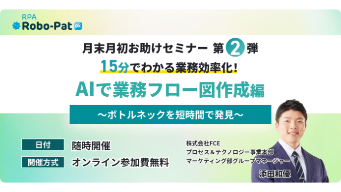 FCEでは今回ご紹介したような業務整理をプロと一緒に無料で行う「業務棚卸し体験会」や、プログラミング知識不要で作れるRPAロボパットDXの無料トライアルを実施しています。