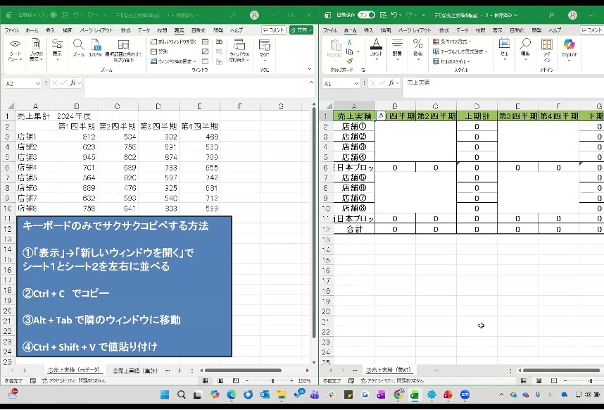 画面を並べたら、マウスを使わずに以下のショートカットだけで転記を行いましょう。