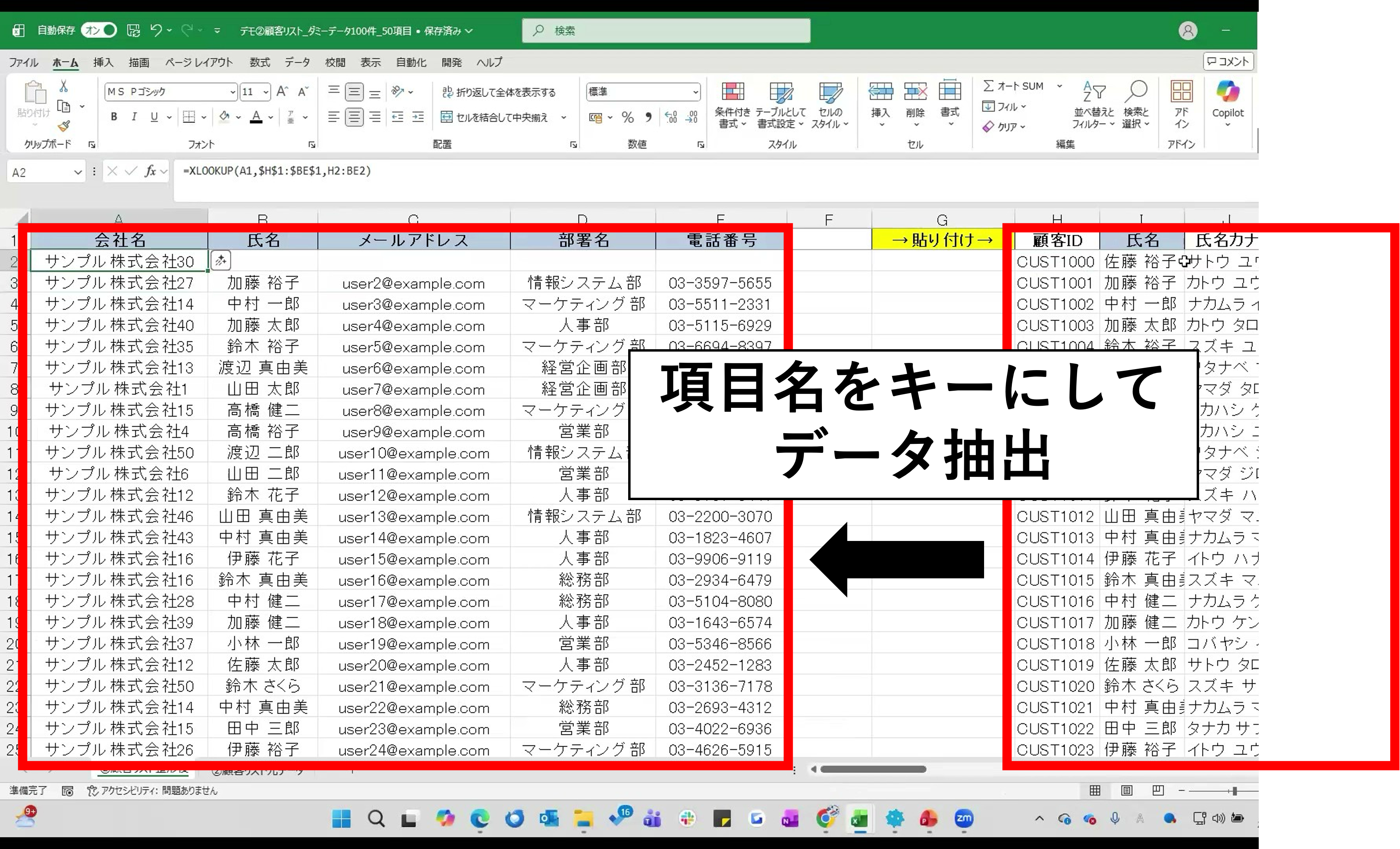 書き方としては、=XLOOKUP(検索値,検索範囲,戻り範囲, [見つからない場合,一致モード,検索モード]このような関数を記載するだけで、「会社名」や「氏名」など必要な項目だけを自動で抽出してくれます。