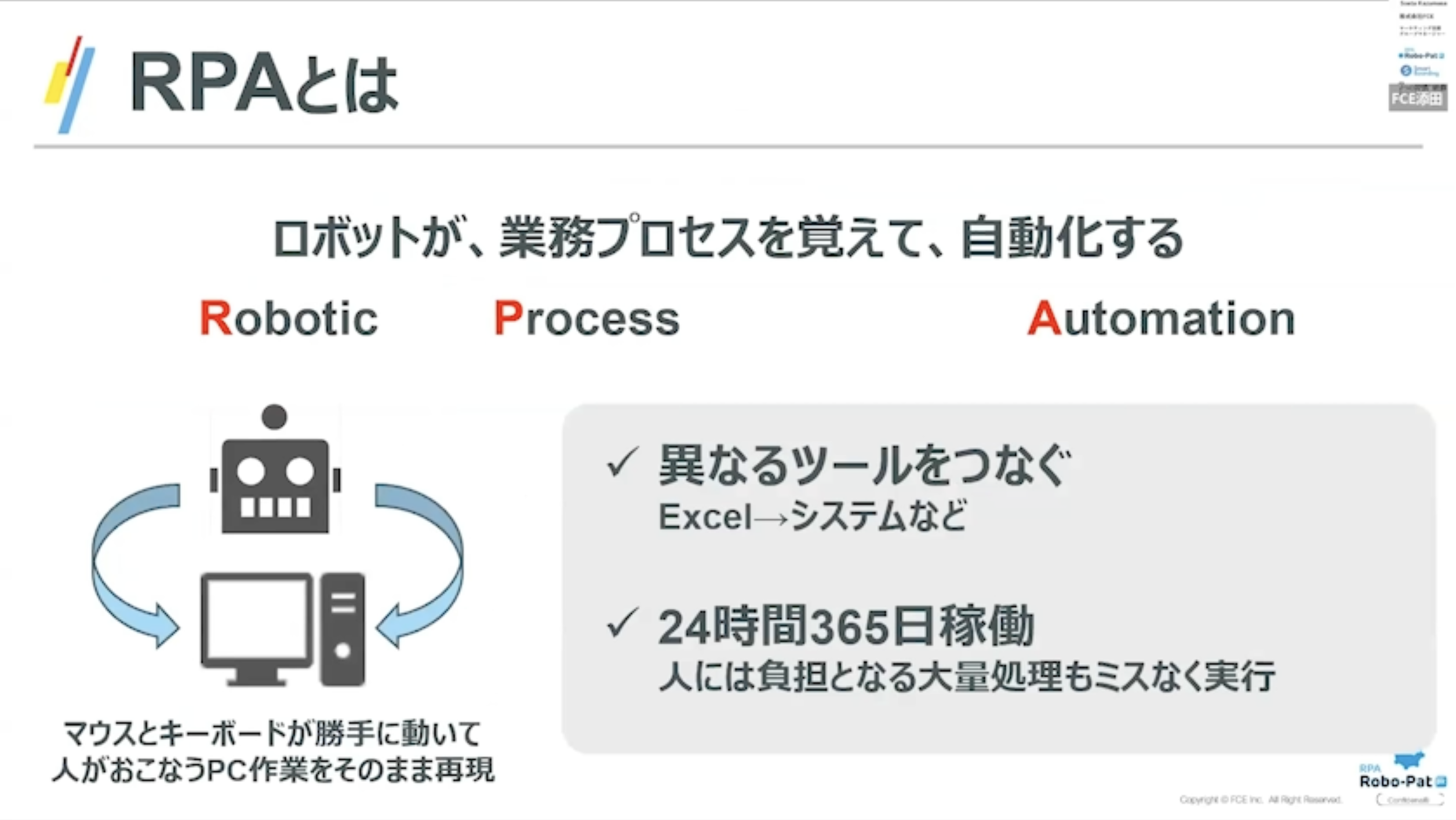 RPAとはロボットが、業務プロセスを覚えて、自動化するという技術です。