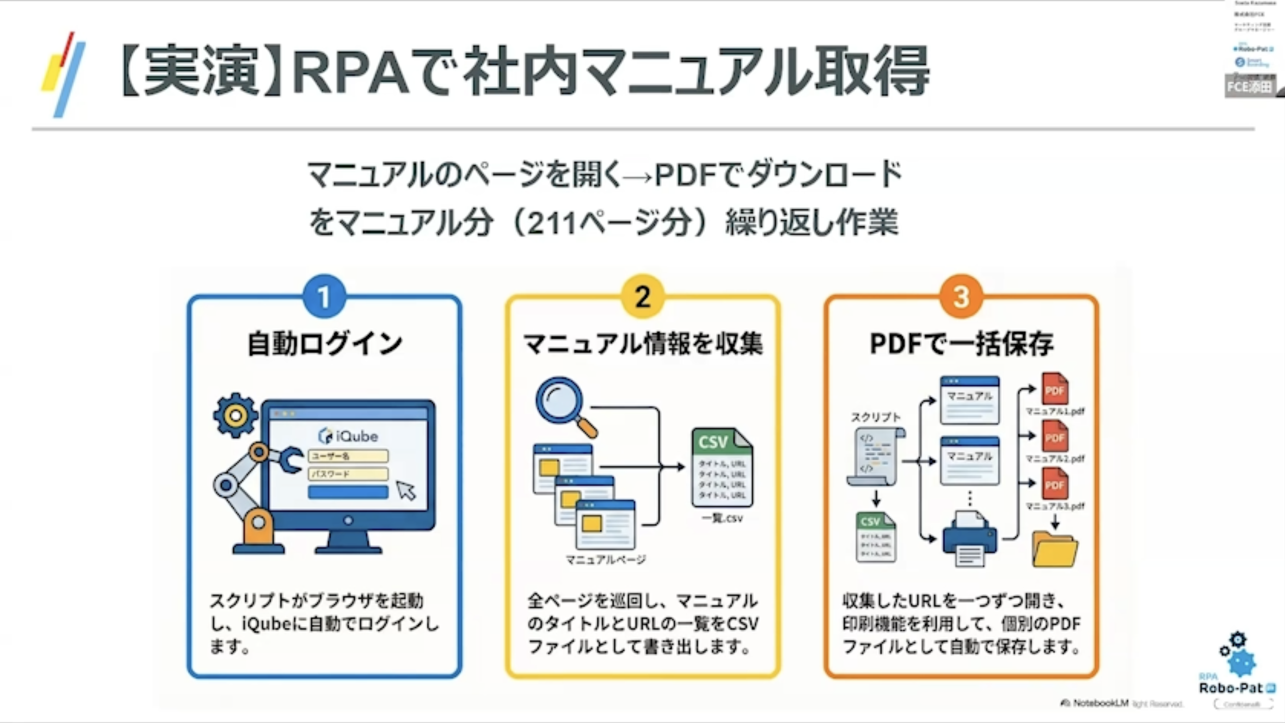 社内ポータルやクラウド上に散らばったマニュアルを常に最新の状態にしておくのは大変な手間です。ここでRPA(Robotic Process Automation)が活躍します。
