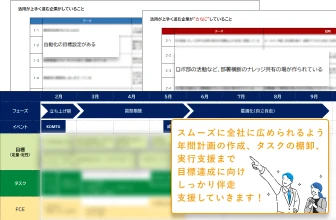 1社1社の風土や慣例を理解した上で、他社様で成果がでている進め方をご提案します。一人ひとりの役割をしっかり明示したプロジェクト推進にするのがコツです。