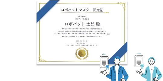 社内でDXを促進していくためのベンダー資格取得プログラムです。5つの研修を受講し、指定課題をクリアされた方に「ロボパットマスター認定証」を発行しています。スキルアップや評価基準としてご活用いただいています。
